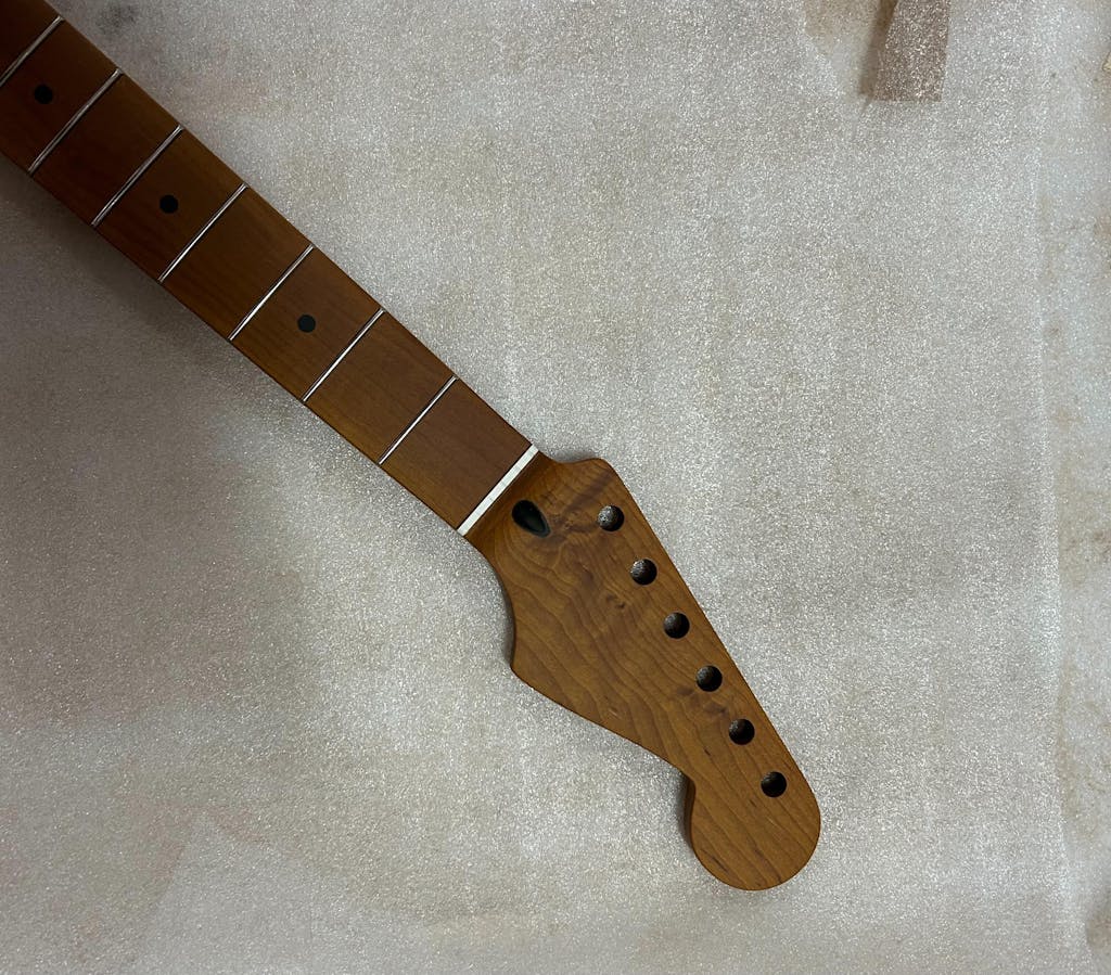 Maßgefertigter Gitarrenhals im Strat-Stil. Erhältlich in den Ausführungen Nitro, Poly, Schellack und Öl.